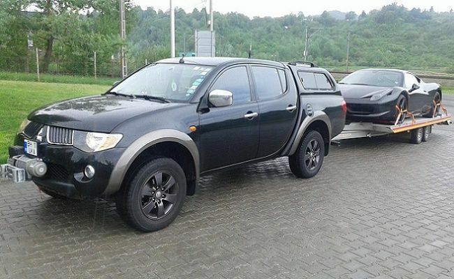 Autoutilitară pick-up Mitsubishi 4x4 cu remorcă tip platformă.